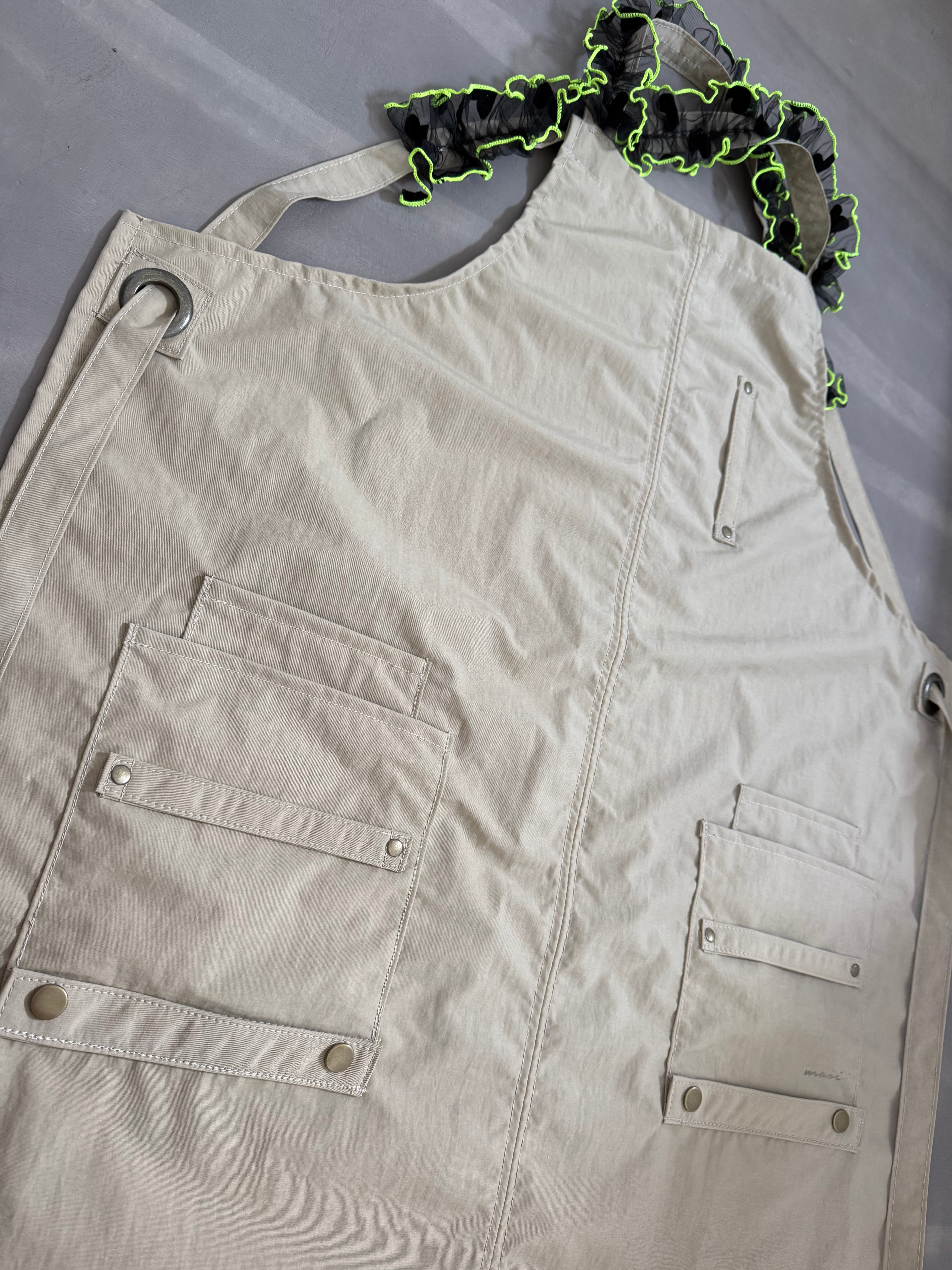 肩紐は背中でクロスして腰で結ぶ定番のタイプになります。胸元〜腰までの間だけボリュームのあるフリルリボンが付いていますので、紐を結ぶ際は結びやすくしています◯