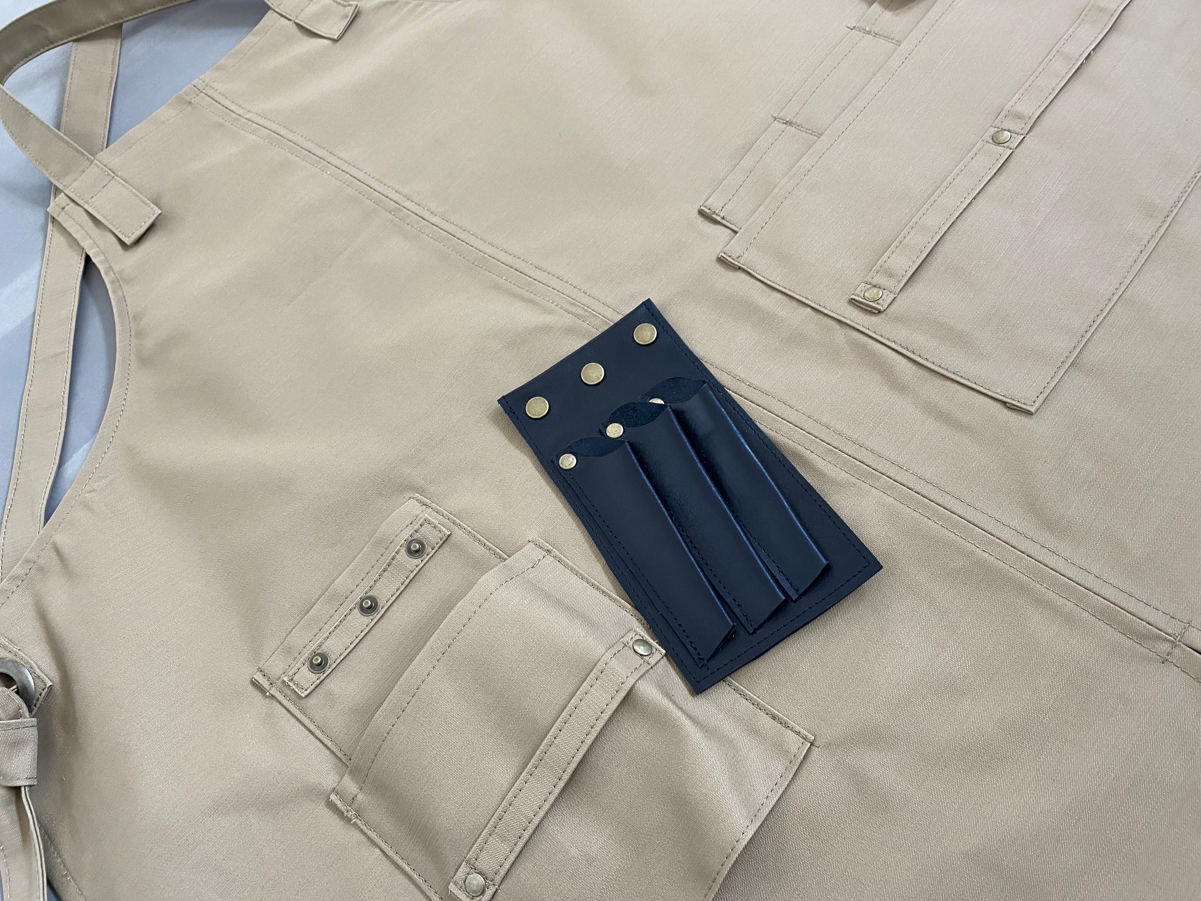 シザーケースの上からベルト付きのカバーポケットが付いています。底が空いていますので、シザーケースの着脱、髪がたまらない仕様になっています。