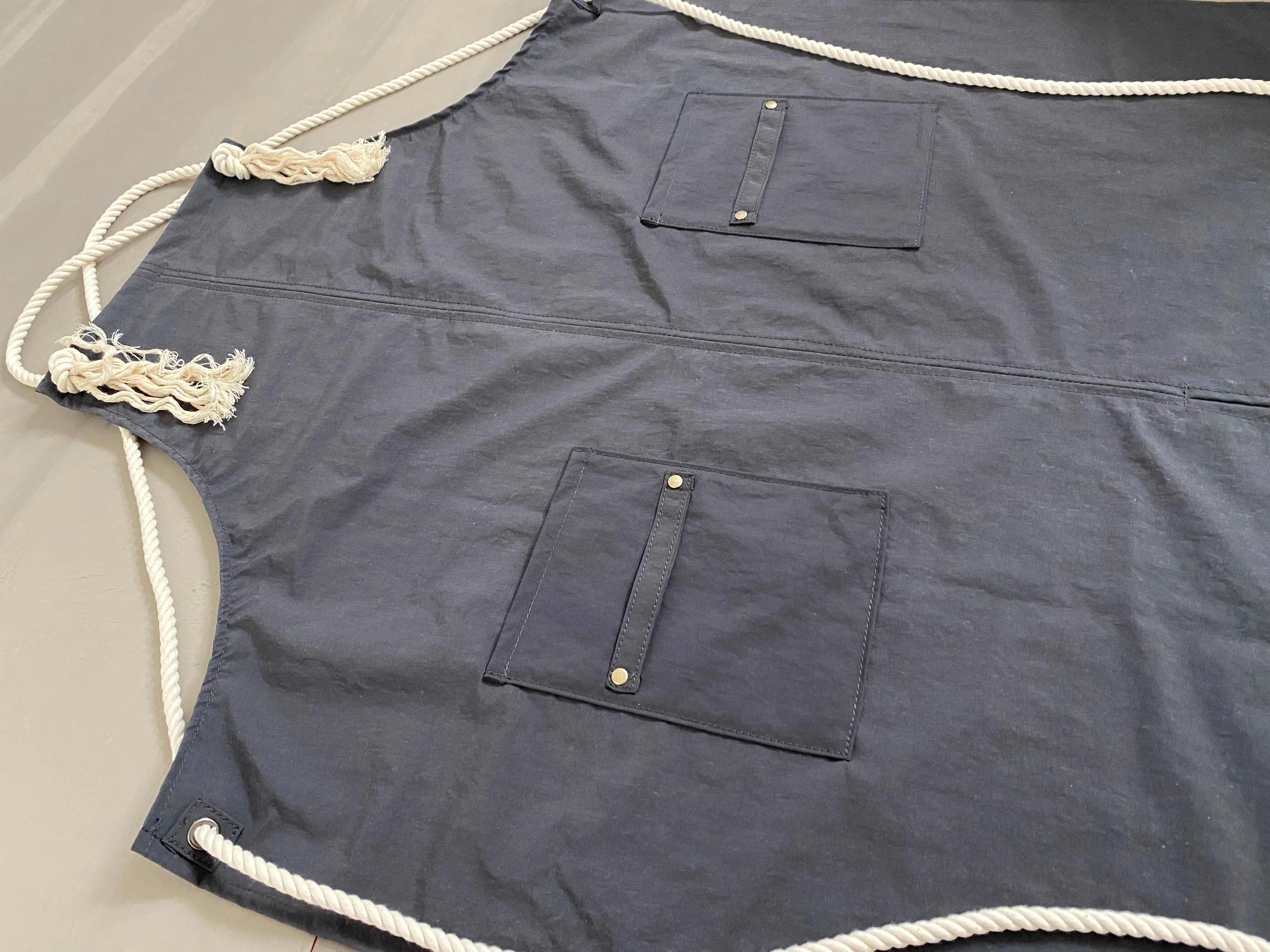 生成りのロープを合わせて、紐先のフリンジが可愛い個性のあるエプロンに仕上げました。