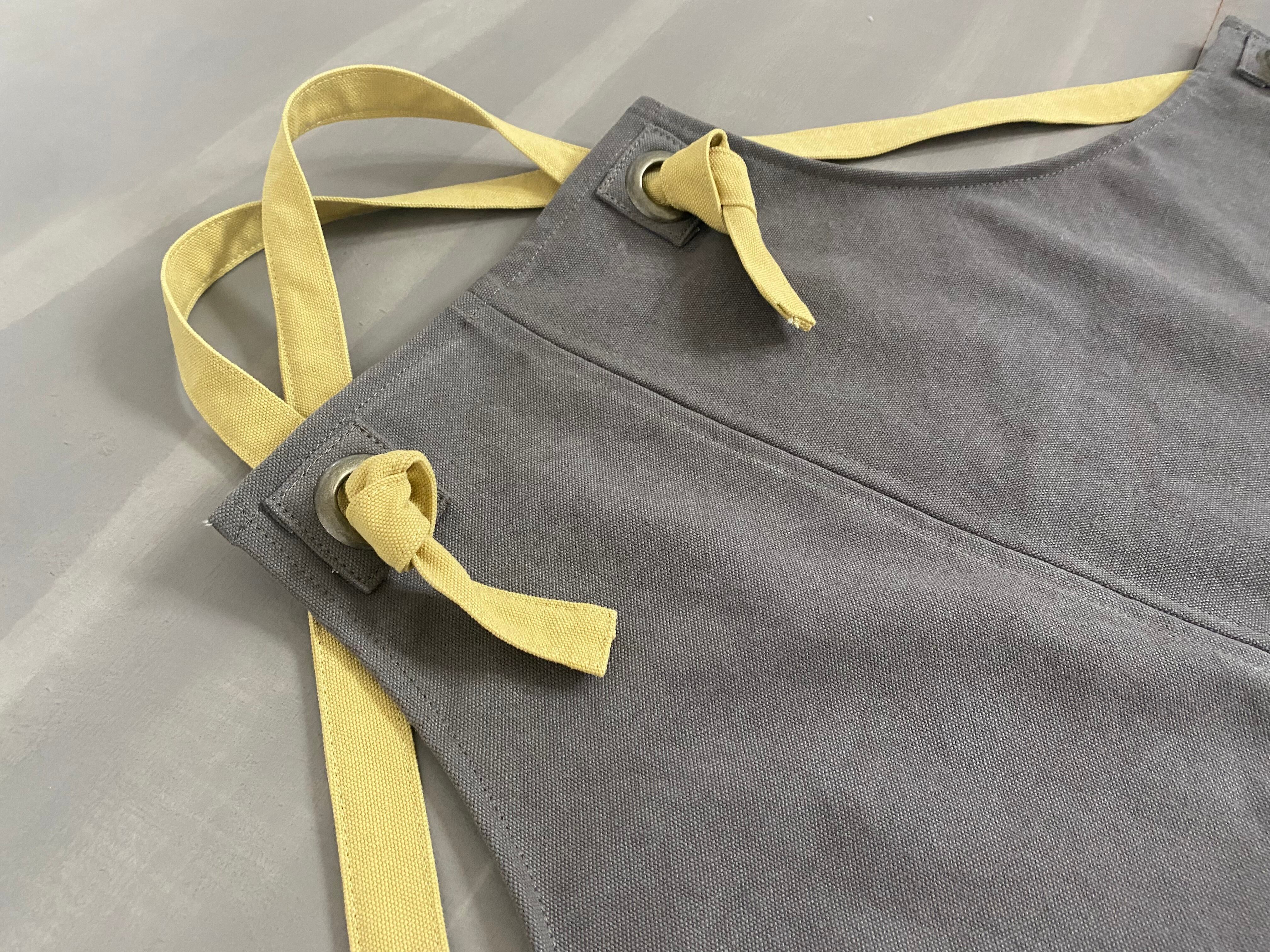 帆布の丈夫さはありますが、柔らかく軽い質感なので着用しやすいです。肩紐は紐の結び目でサイズ調節できる被りタイプ。1度ご自分のジャストなサイズ感にしておけば、着脱の度に紐を結んだりする手間はありません。